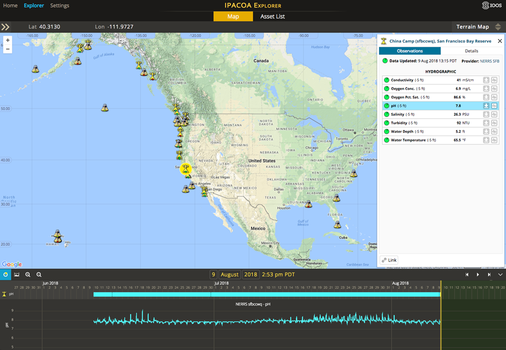 The IPACOA data portal provides ocean acidification relevant data for diverse user groups, from shellfish growers to scientists to managers to the public. Originally built for the west coast of the United States, the geographic scope of the portal is now expanding to the entire nation with support from U.S. IOOS and NOAA’s Ocean Acidification Program (OAP) and to Canada, through our partnership with the Hakai Institute and others. The data served here come from diverse partners, including NOAA’s Pacific Marine Environmental Laboratory (PMEL) and many academic and industry providers coordinated by through the various U.S. IOOS regional associations. For further information about ocean acidification, follow the national and regional links, represented by the icons below, as well as links to information on sensors from the Alliance for Coastal Technologies and regional acidification networks.